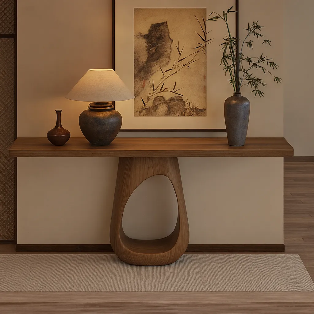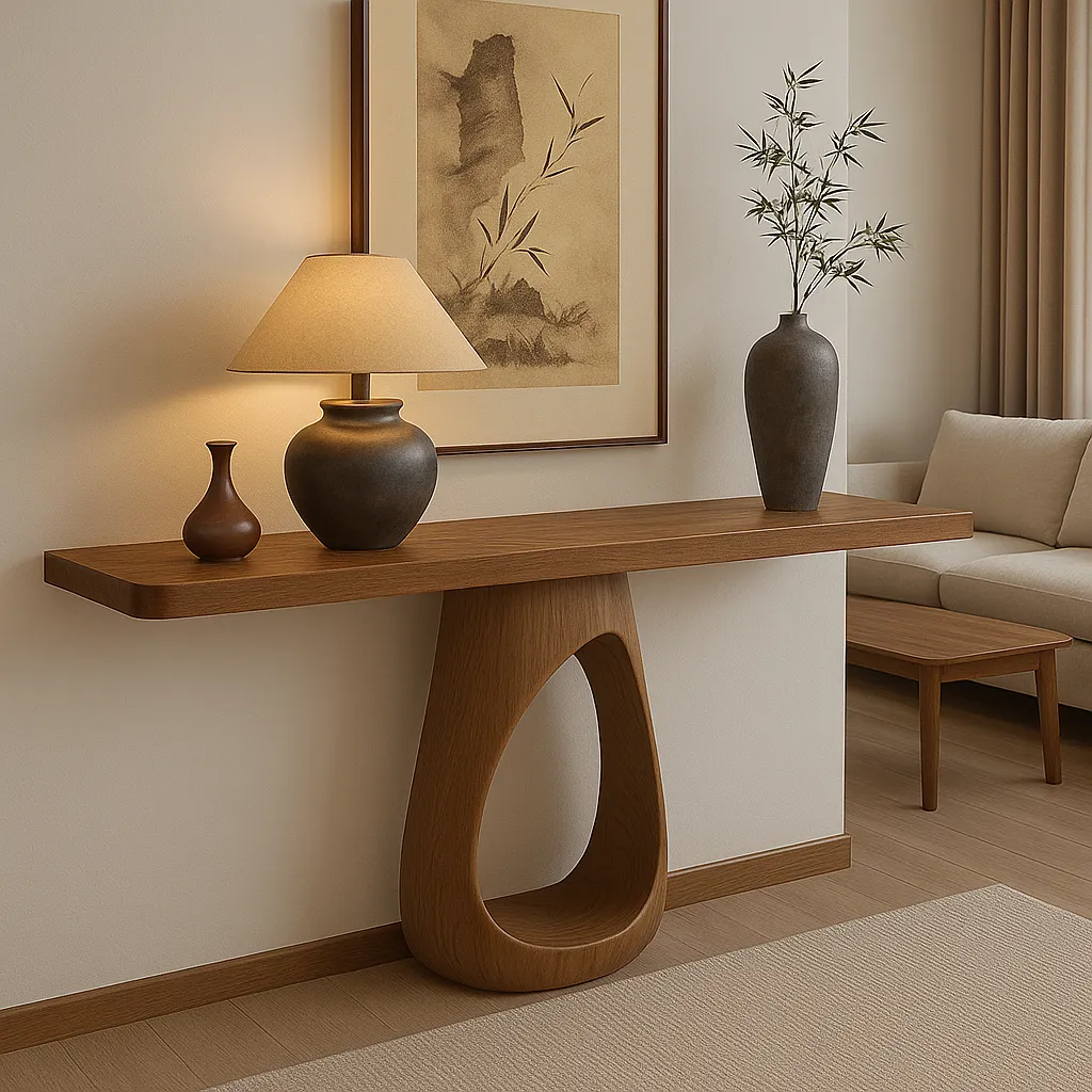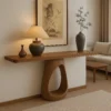 Designed with a refined contemporary look, this wooden console table makes an elegant statement in any home. Its rectangular top rests on a sculptural cut-out base, creating a balance of clean lines and artistic form. Crafted from natural wood, the piece offers a sturdy structure and a smooth surface for displaying lamps, vases, decor. The unique base design adds visual interest while ensuring stability and long lasting use.