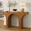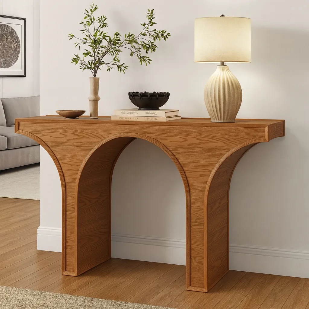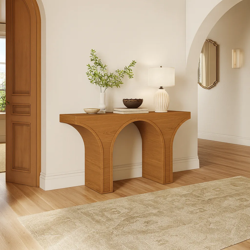 Crafted with a striking silhouette, this wooden console table brings a touch of architectural elegance to home interiors. Its rectangular top is supported by arched legs, blending clean lines with a refined contemporary design. Constructed from natural wood, the table provides a sturdy and durable structure while showcasing the warmth of its grain. The open arch design adds visual depth, making the piece as decorative as it is functional.