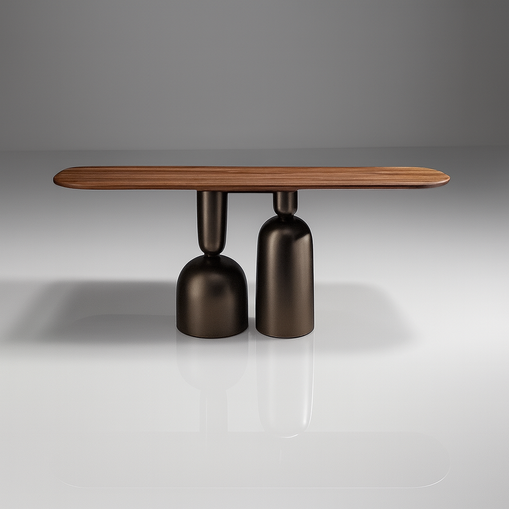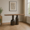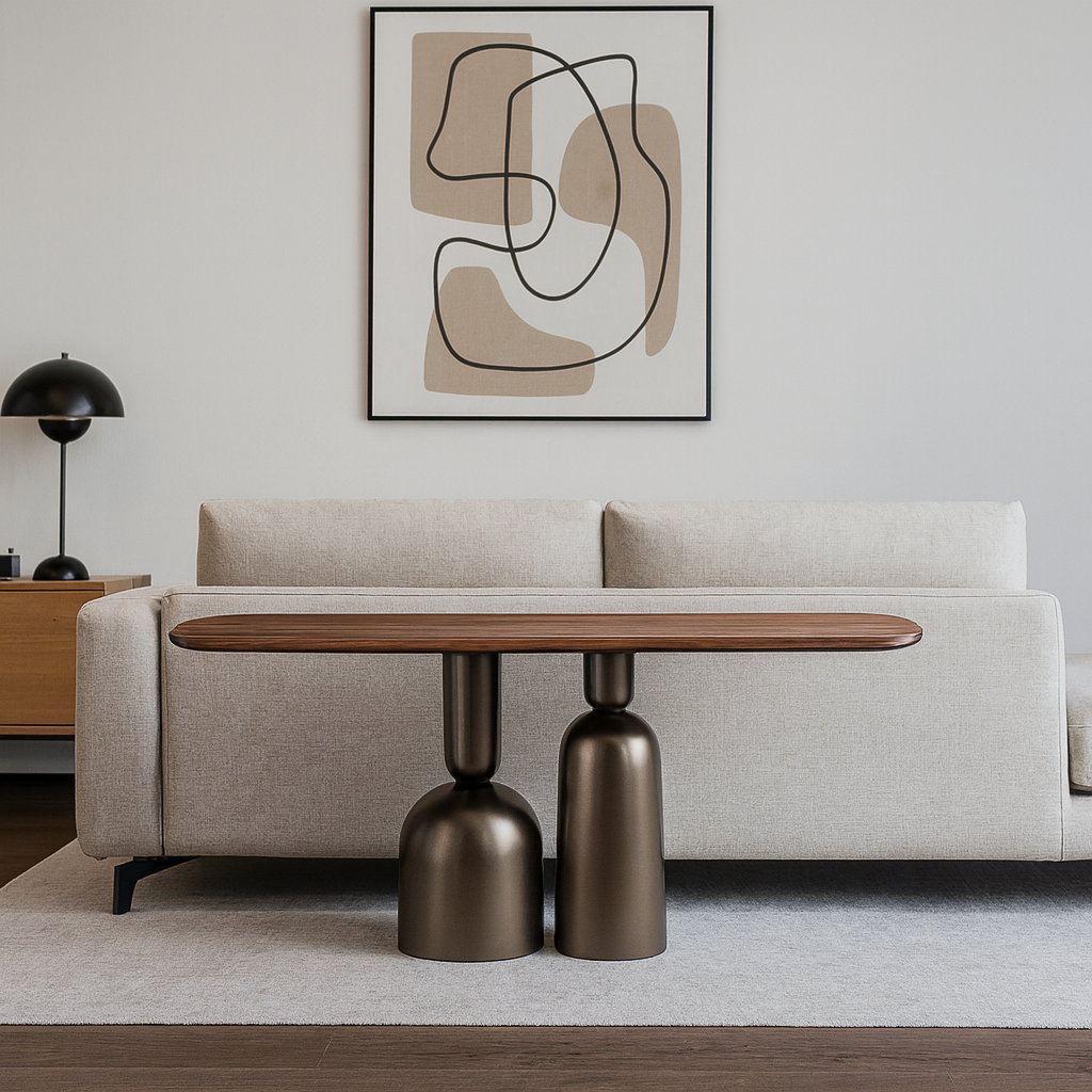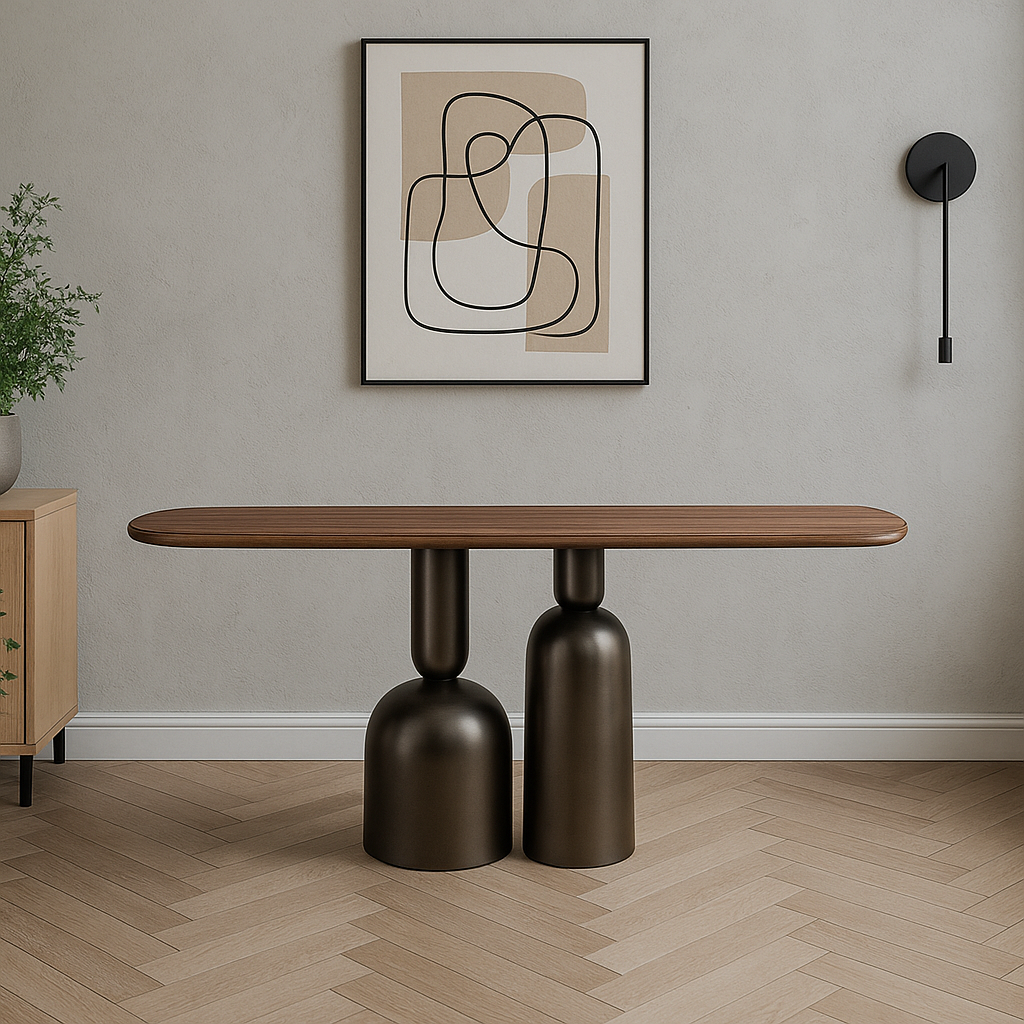 Designed with a modern artistic touch, this wooden console table brings a bold statement to any living room or hallway. Its elongated top rests on sculptural pedestal bases, creating a balance between function and visual appeal. Crafted with a smooth wooden surface, the table provides ample space for displaying decorative pieces, books or lamps. The distinctive base adds a sculptural element, giving the piece a contemporary edge while ensuring stability.